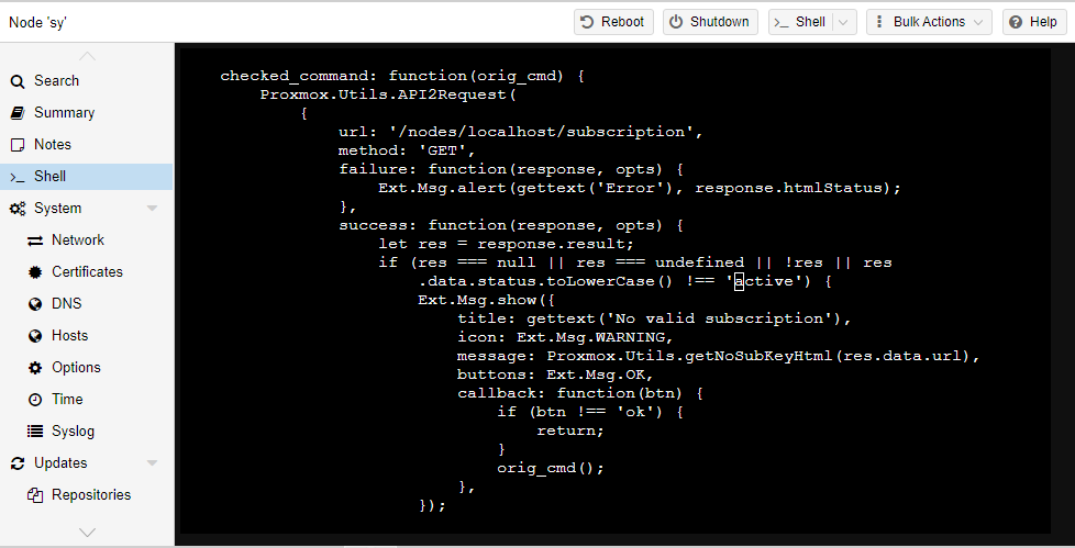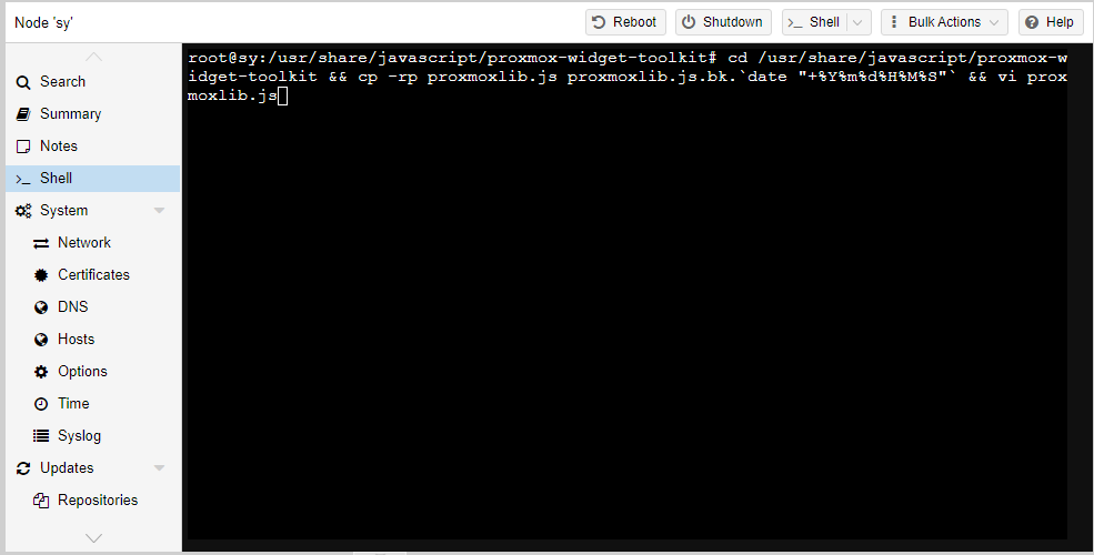 | cd /usr/share/javascript/proxmox-widget-toolkit && cp -rp proxmoxlib.js proxmoxlib.js.bk.`date "+%Y%m%d%H%M%S"` && vi proxmoxlib.js |