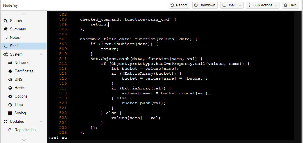 Shell 접속 후 root 계정으로 proxmoxlib.js파일을 수정한다.
