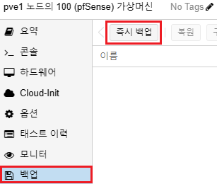 2. 가상머신 또는 컨테이너 선택 후 백업(Backup) 메뉴 클릭 후 즉시 백업(Backup now) 버튼 클릭