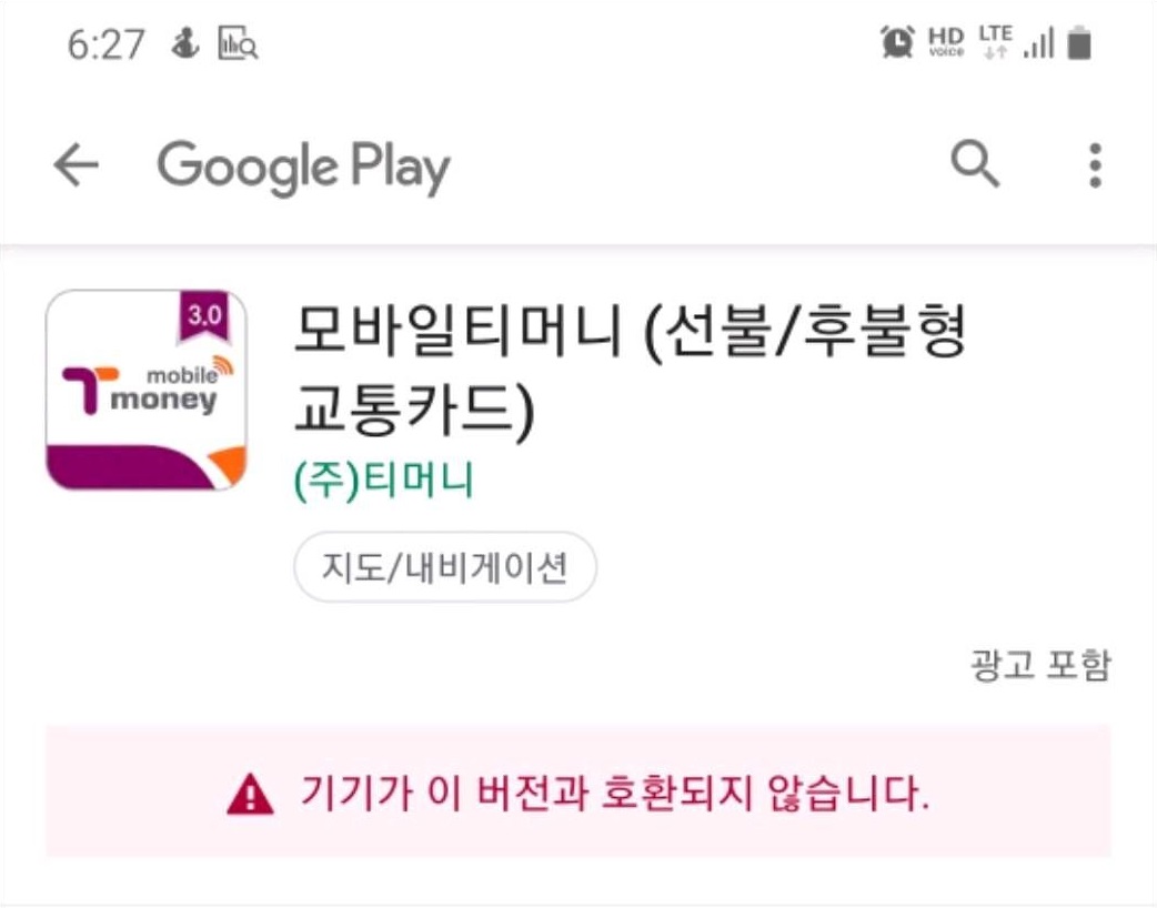 구글 스토어에 등록된 티머니에는 호환되는 기기목록에 갤럭시 A50이 누락되어있습니다.