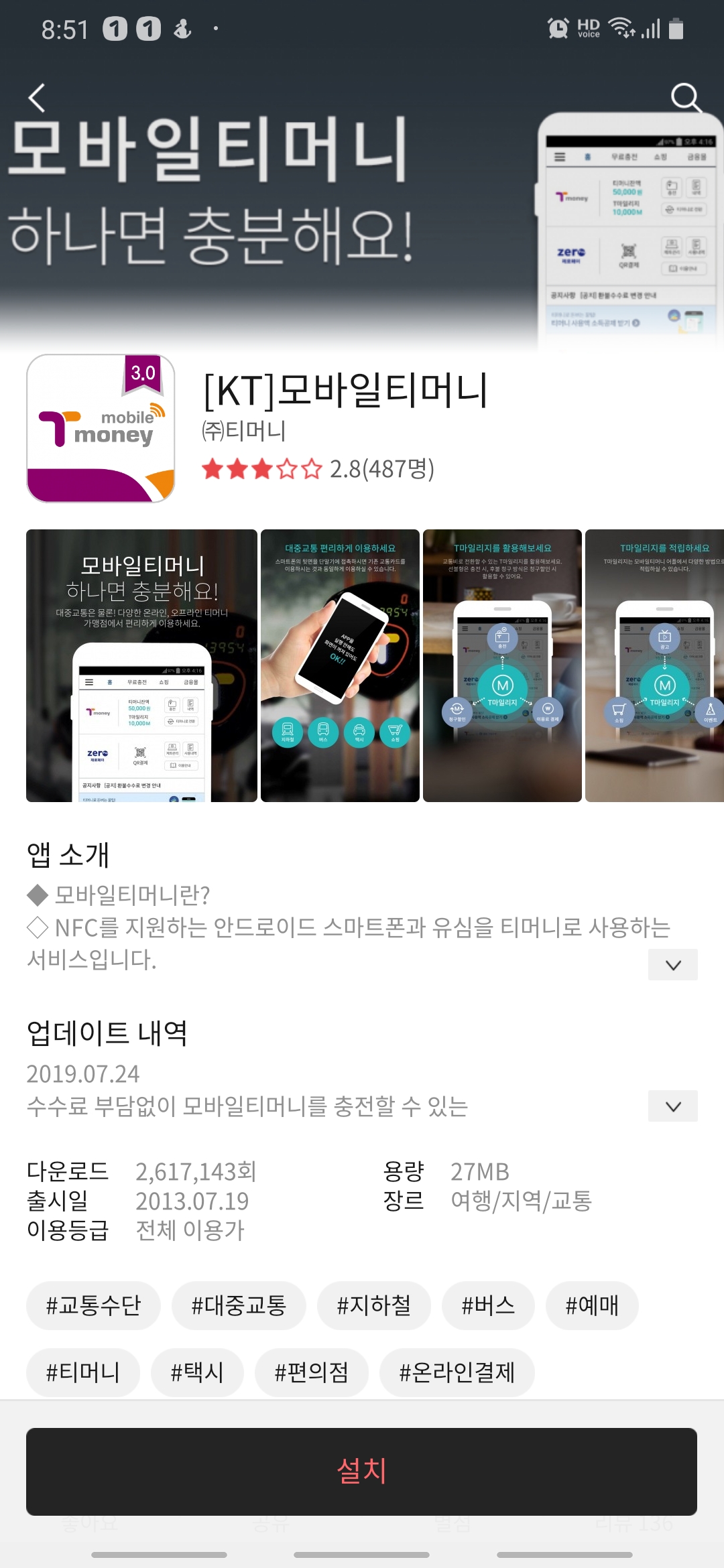 이상 티머니 설치한 모습과 삼성페이에 티머니 등록한 모습입니다.