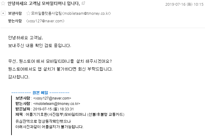 따라서 티머니측에 기능은 동작하며 호환기기 추가해줄것을 요청하니 아래와 같이 답변이 왔습니다.