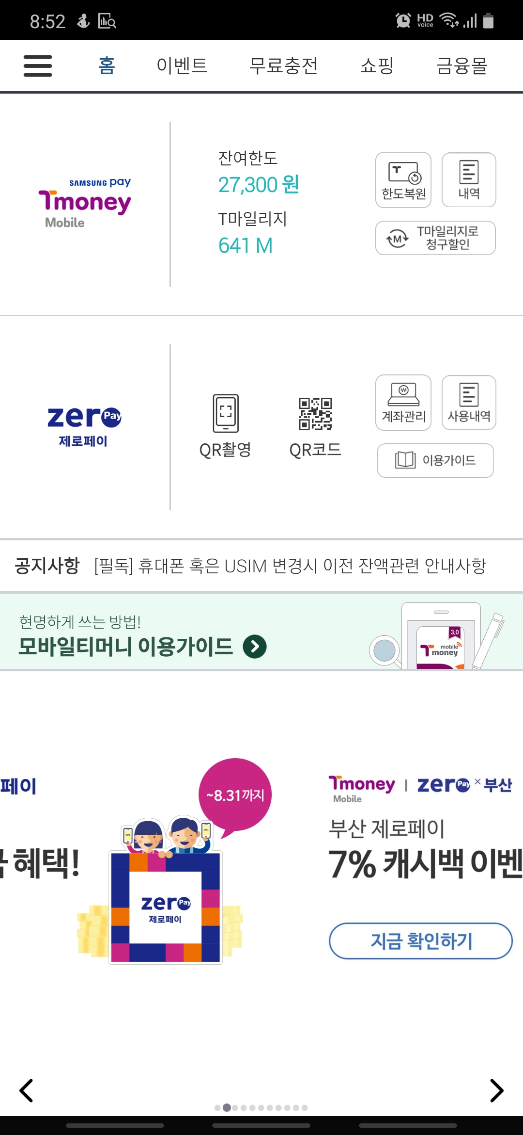 먼저 사용하던 유심을 A50에서 사용하기때문에 유심에 저장된 티머니잔액이 동작하는지 확인해보니
