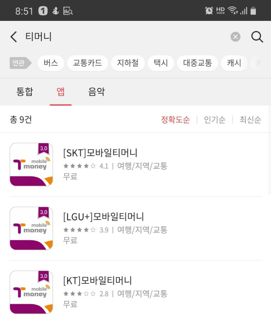원스토어 설치 및 가입이 완료되었으면 원스토어에서 티머니를 검색 후 해당하는 통신사의 티머니를 선택합니다.